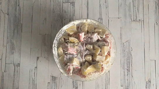 - Meng in een kom vlees, aardappelen, wortelen en zure roomdressing.