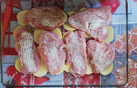 - Bedek de ovenschaal met folie, bestrijk deze met plantaardige olie, leg een laag aardappelen, zout en breng op smaak. Leg het vlees erop, bestrijk het met zure room.