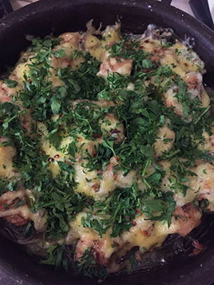 - Haal de schaal uit de oven, bestrooi hem met kaas en zet hem 10-15 minuten terug in de oven. Als de kaaskorst bruin is, is het gerecht klaar, bestrooi met gehakte kruiden en serveer.