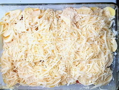 - Controleer vlees en aardappelen op gaarheid. Strooi de geraspte kaas over de schaal en zet hem nog 15-20 minuten in de oven.