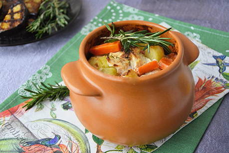 - Verdeel de resulterende massa in potten. Plaats laurierblaadjes en rozemarijn in elke pot, bedek ze met deksels en plaats in de oven. Rooster de kalkoen en aardappelen 60 minuten op 180 graden.