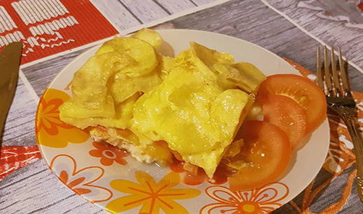 - Schil en spoel de aardappelen, uien en knoflook onder stromend water. Snijd de aardappelen in middelgrote plakjes, hak de ui en knoflook fijn met een mes. Snijd het kalkoenvlees in blokjes.