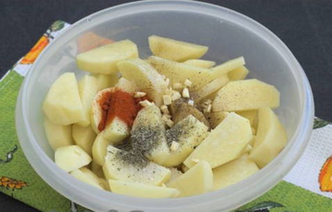 - Aardappels schillen, wassen en in partjes snijden. Combineer aardappelen met een beetje zonnebloemolie, zout en kruiden.