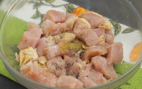 Was de kalkoenfilet, snij in blokjes, doe in een kom, voeg zout, kerrie en gemalen peper toe, roer.