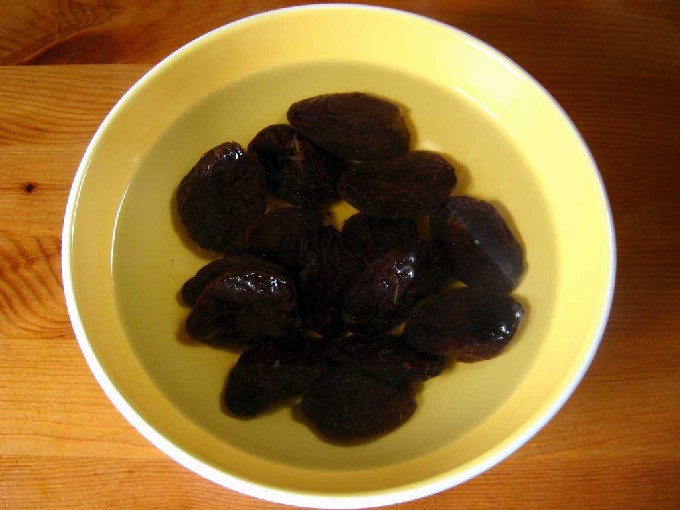 - Giet de pruimen 20 minuten met heet water, spoel ze af en snijd ze doormidden.