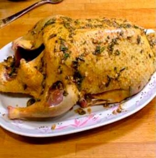 - Haal de gebakken vogel uit de oven. Gooi de sinaasappels en bleekselderij weg, ze zijn niet meer nodig.