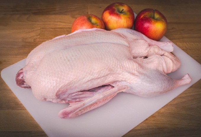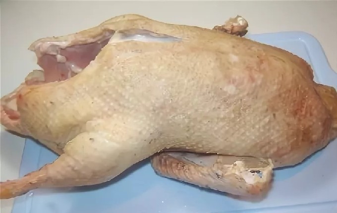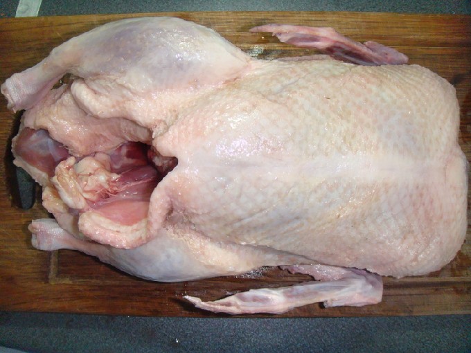 - Bereid eerst het pluimveekarkas voor op het bakken. We verwijderen de resterende veren met een pincet, schroeien het karkas, als er pluisjes op zitten, en spoelen grondig met heet water. Droog de vogel vervolgens af met een theedoek.