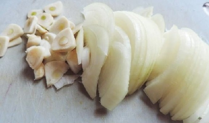 - Snijd de uien in dunne halve ringen, hak de knoflook in plakjes.