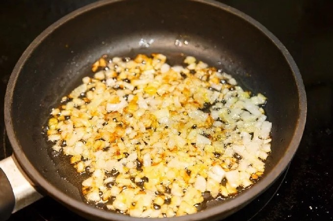 - Fruit de gesnipperde ui en knoflook in hete olie tot ze goudbruin zijn.