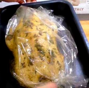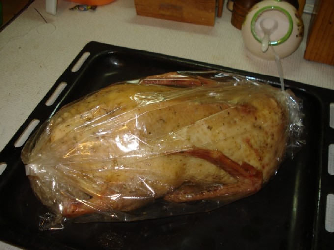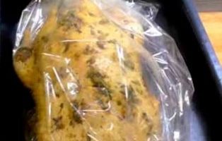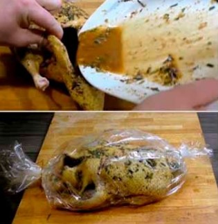 Verwijder 's morgens de film van het karkas en giet de marinade gevormd in de plaat in de buik van de vogel.