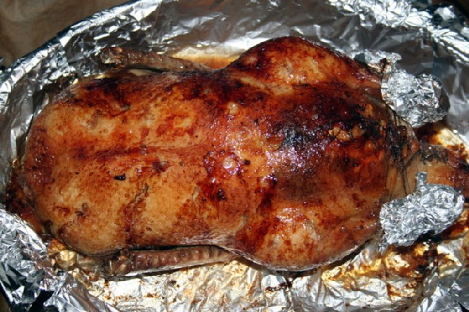 - Wikkel het karkas vervolgens in folie en plaats het 2 uur in een voorverwarmde oven op 180 ° C. Open vervolgens de folie en bak de vogel nog 20 minuten tot een heerlijke korst.