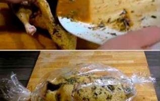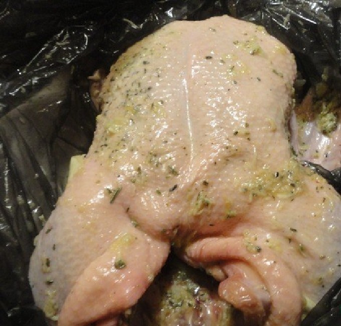 - Leg het gevogelte op een groot bord en giet het gekookte citroensap met kruiden erover. Dek het karkas af met huishoudfolie en zet het 2 uur in de koelkast om te marineren.