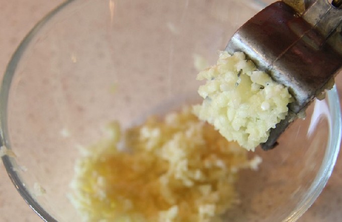 - We doen deze snee in een kom, voegen gehakte knoflook toe en mengen alles.
