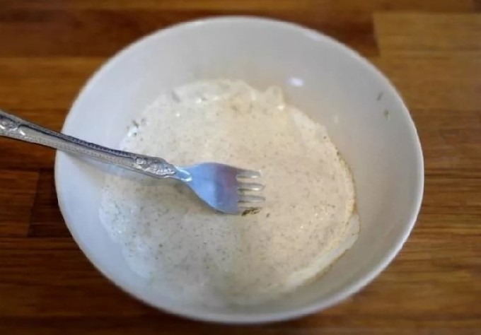 - Doe zure room in een kom, voeg suneli-hop toe (u kunt naar eigen goeddunken kruiden kiezen), gehakte knoflook, zout en meng alles.