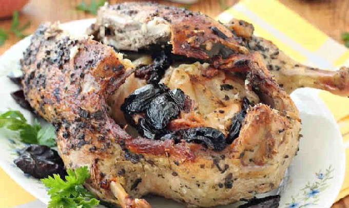 Binnen gebakken met pruimen - een gerecht alleen voor de vakantie. Het zijn de pruimen die het gebakken gevogelte een bijzonder pikant aroma en smaak geven. Voeg appels toe aan de vulling om de vogel zacht en sappig te maken. We marineren het in honingmarinade met toevoeging van sojasaus en mayonaise. We bakken in de hoes. Probeer het, het is heerlijk!