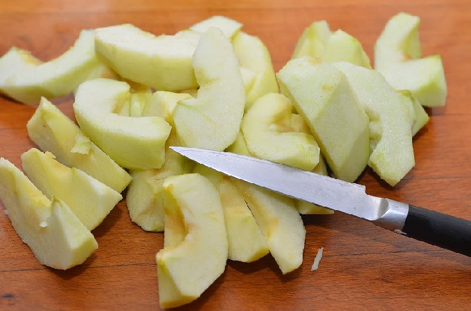 - Schil en snijd appels (bij voorkeur zoete varianten) in kleine partjes.