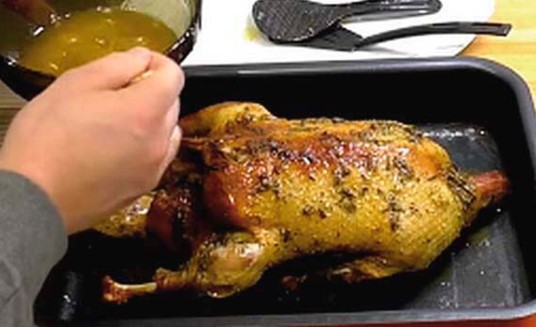 - Giet tijdens het bakken het karkas periodiek met sap en vet van een bakplaat en draai het om zodat het hele karkas bedekt is met een gouden korst.