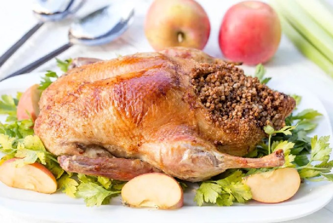 - Vul de buik van de vogel met gehakte appels en zet de vulling vast met tandenstokers.