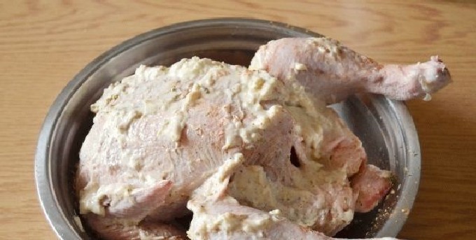- Meng in een kom mayonaise met gehakte knoflook op welke manier dan ook en wrijf het hele pluimveekarkas in met het resulterende mengsel.