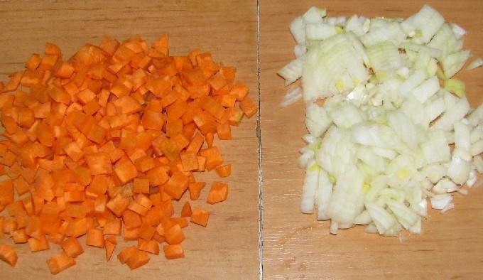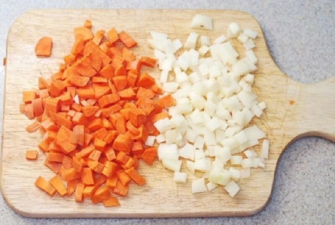 - Schil de ui, wortel en snijd ze in kleine blokjes.