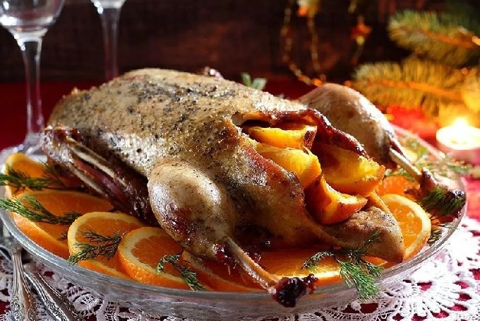 Binnen wordt gebakken met citrusvruchten volgens hetzelfde principe als gewone eend. Sinaasappels geven het vlees van deze vogel altijd een heerlijk aroma en pikante smaaktonen. Het belangrijkste hoogtepunt van dit gerecht is de honing-oranje glazuur.