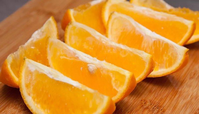 - Spoel de tweede sinaasappel af, dep droog met een servet en snijd in partjes.