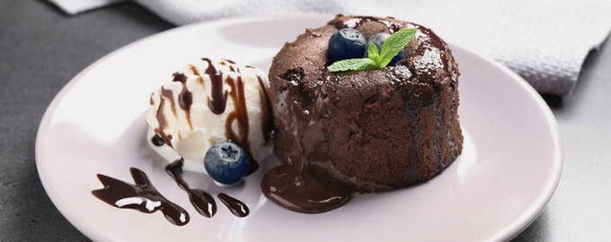 Fondant is een verbluffend spectaculair chocoladedessert, een muffin of muffin met gebakken muren met een vloeibaar centrum. Complementeer de chocolade