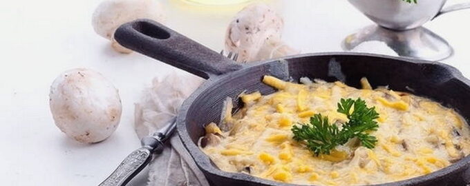 Kip en Champignon Julienne - Een gerecht dat als warm voorgerecht of als hoofdgerecht kan worden geserveerd, en bestaat uit stukjes vlees en plakjes champignons