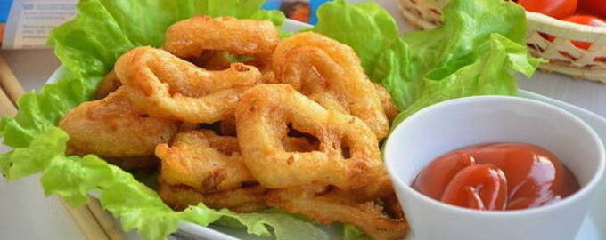 Zeevruchten zijn populair over de hele wereld. Krokante inktvisringen in beslag kunnen zowel een hoofdgerecht zijn voor het diner als een snack voor bier.
