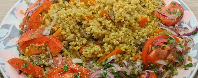 Kruimige pilaf met kip in een slowcooker Redmond Pilaf is een traditioneel oosters gerecht op basis van gekookte kruimelige rijst.