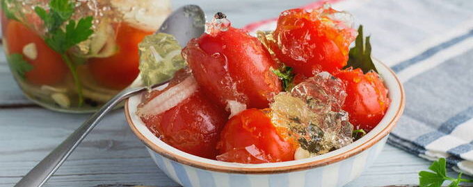 Tomaten in gelei - een naad waar iedereen blij mee is. Er zijn genoeg recepten om dergelijke tomaten te maken om degene te vinden die bij je past.