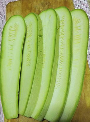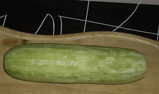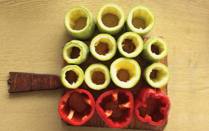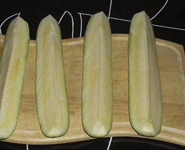 - Courgette moet dun en langwerpig zijn. Was ze, snijd ze in stukken van 5-6 centimeter breed en verwijder het vruchtvlees.