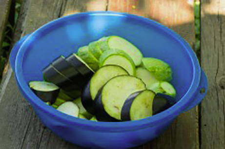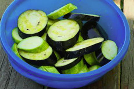 - Was de courgette en aubergines, dep ze droog met keukenpapier en snijd ze in plakjes. Doe de groenten in een grote kom.