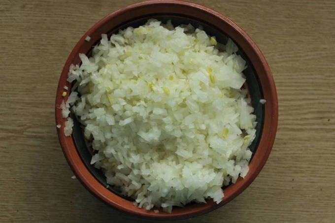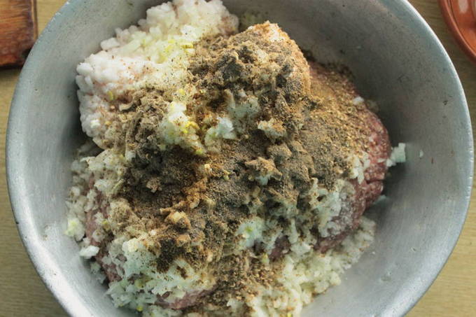 - Voeg ui en vet toe aan het gehakt. Voeg ook zout en kruiden toe, meng goed met je handen.Het gehakt moet glad en stroperig zijn.