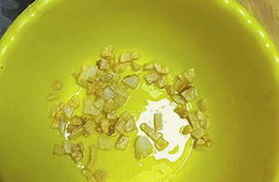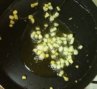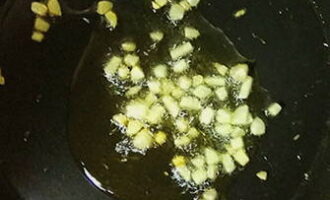 Pel en snijd de knoflook in kleine blokjes. Verhit olijfolie in een koekenpan, bak de knoflook licht goudbruin.