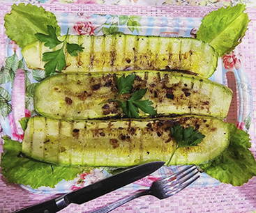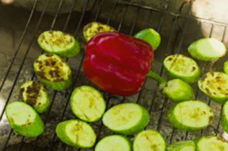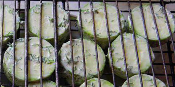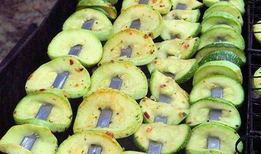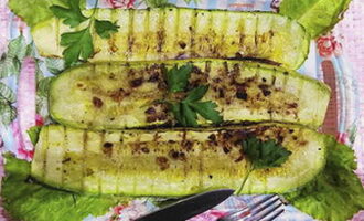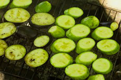- Leg de courgettepartjes vervolgens op een rooster en rooster ze boven hete kolen. Kook tot ze zacht en goudbruin zijn. De gebakken courgette kan zowel warm als gekoeld geserveerd worden.