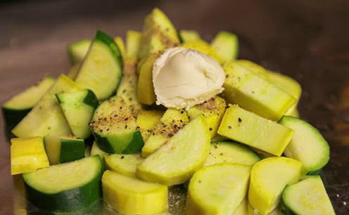 - Leg de groenten op een vel folie, je kunt ze in meerdere porties verdelen. Voeg boter toe aan de courgette.