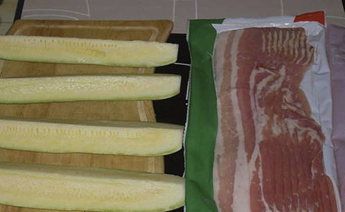 - Zout de courgetteplakken licht. Snijd het spek in dunne reepjes.