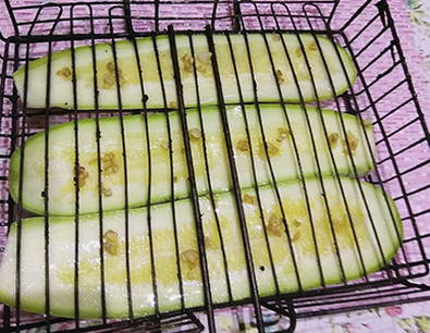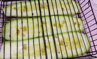 Vet de courgette aan beide kanten in met geurige olie en leg ze op een rooster.