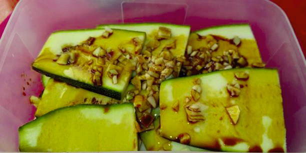 - Doe de courgettepartjes in een kom, voeg knoflook, sojasaus en olijfolie toe en meng goed.Zet de courgette 30-60 minuten in de koelkast om te marineren.