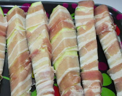 - Wikkel elke courgette wrap in spek in een spiraal.