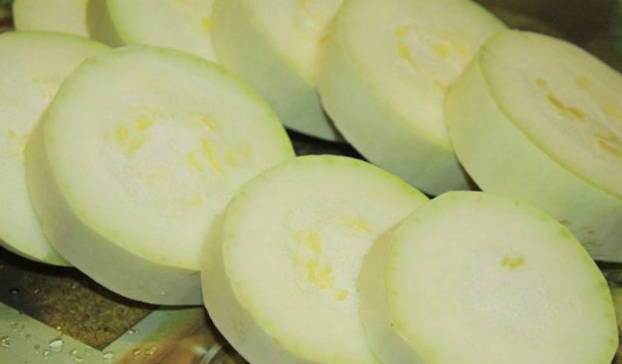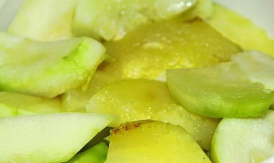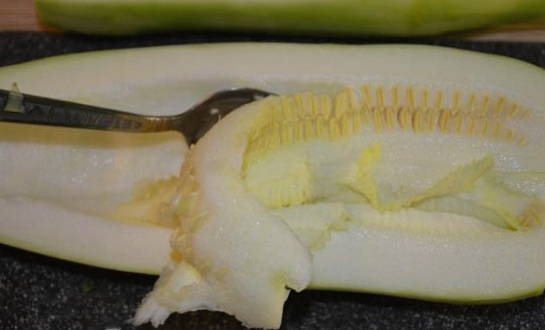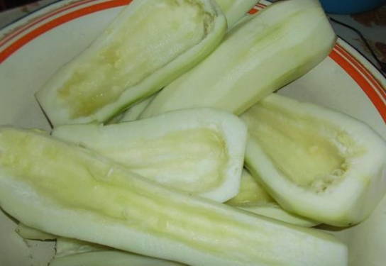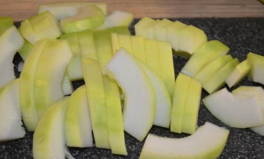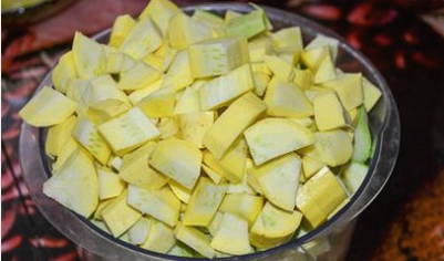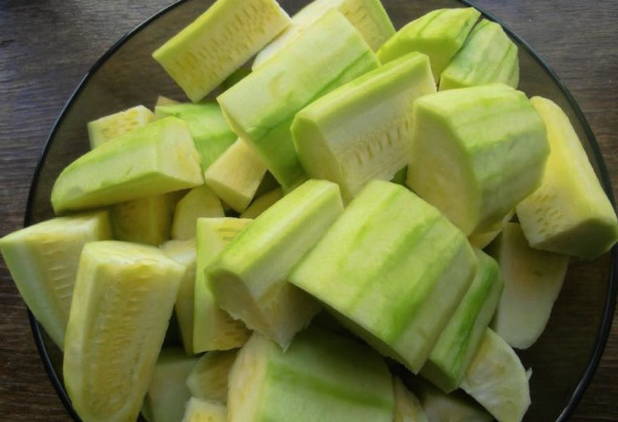 Spoel de courgette goed af. Daarna verwijderen we de schil, zaden en snijden de vrucht zelf in kleine blokjes.