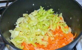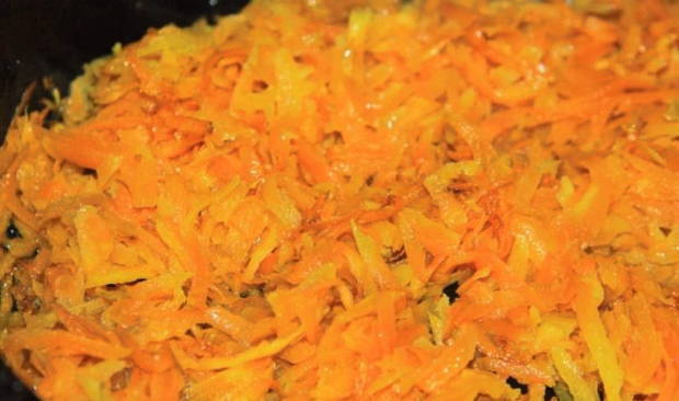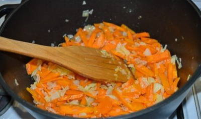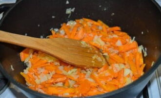 Hak de ui met wortelen en kook in plantaardige olie tot ze zacht zijn.