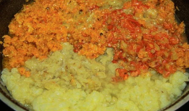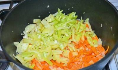 - Hetzelfde doen we met wortelen en paprika's. We combineren alle ingrediënten in een gemeenschappelijke pan.