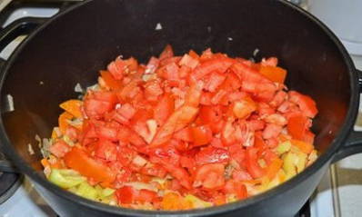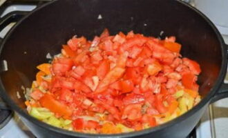 We snijden de tomaten in kleine blokjes en sturen ze naar de totale massa.