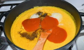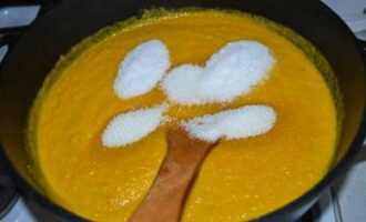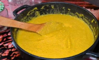 - We sturen de voorbereide massa in een pan met een dikke bodem en zetten op laag vuur.