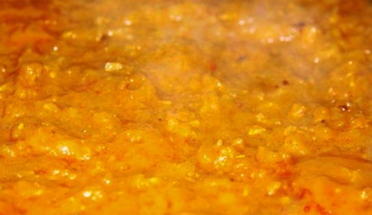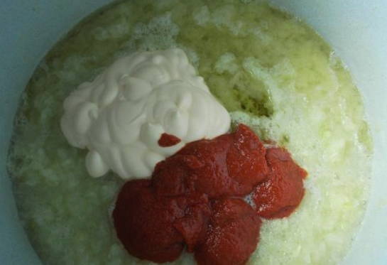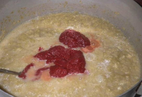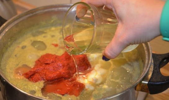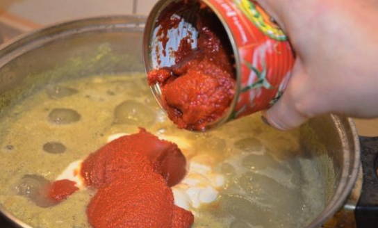 - We beginnen het werkstuk op laag vuur te laten sudderen en aanvullen met tomatenpuree.