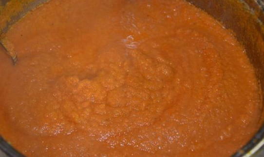 - Doe hier de tomatenpuree en kook de massa 2 uur in de kookstand. Open af en toe het deksel en roer.