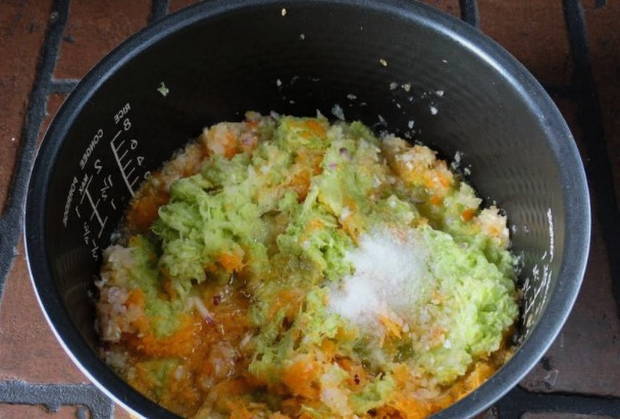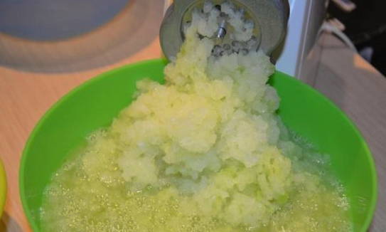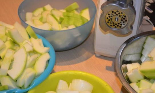 - We wassen de courgette, schillen en scrollen in een vleesmolen.