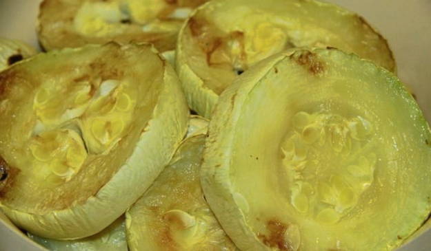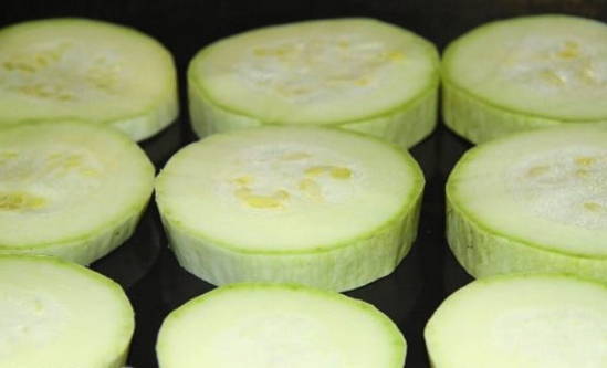 - We wassen de courgette, snijden ze in cirkels en bakken 20 minuten in een voorverwarmde oven op 180 graden.